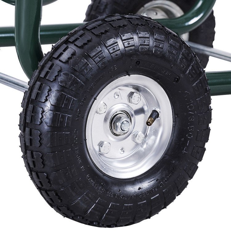 Large capacity up to 300ft 5/8 inch of 5/8" of garden hoseRobust steel construction with a powder-coating finishBuilt-in basket is suitable for gardening accessoriesComfortable foam-padded handleThoughtful non-slip handle grip for easy operationA low center of gravity reel prevents the cart from tipping overEfficiently keeping the hose clean and convenient to usePerfect for home gardening or commercial landscaping10" pneumatic tires that adapt to any terrainEasy to install and assemble
